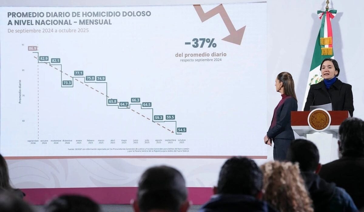 Noviembre 11 de 2025, Ciudad de México.-Durante la conferencia matutina de la presidenta de la República, Claudia Sheinbaum Pardo, realizada este martes, la secretaria ejecutiva del Sistema Nacional de Seguridad Pública (SESNSP), Marcela Figueroa Franco, presentó el informe actualizado sobre la incidencia de homicidios dolosos en el país al mes de octubre de 2025. En