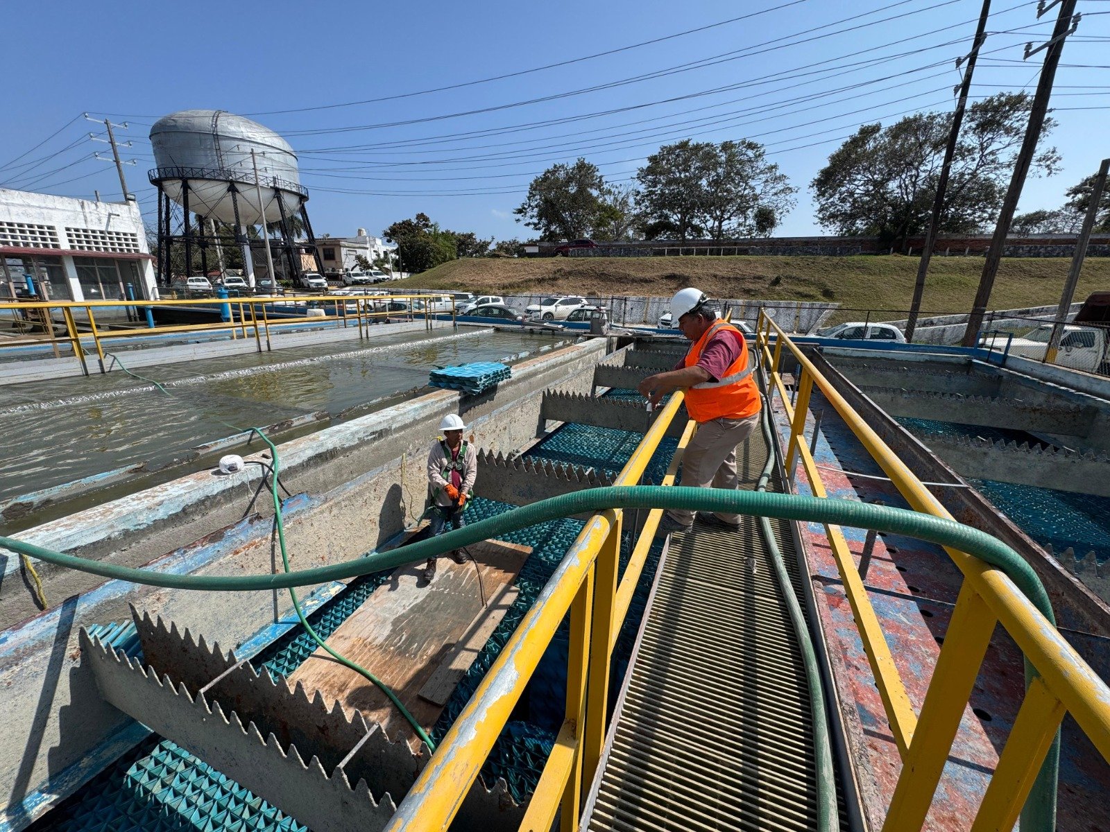 Como parte de las acciones orientadas a conservar en buenas condiciones la infraestructura de tratamiento de agua, COMAPA Sur lleva a cabo trabajos de mantenimiento en el sistema de sedimentadores de la Planta Potabilizadora Altavista.