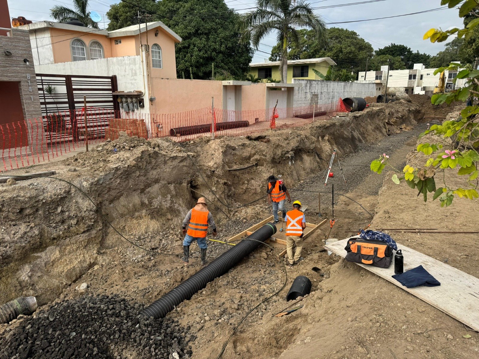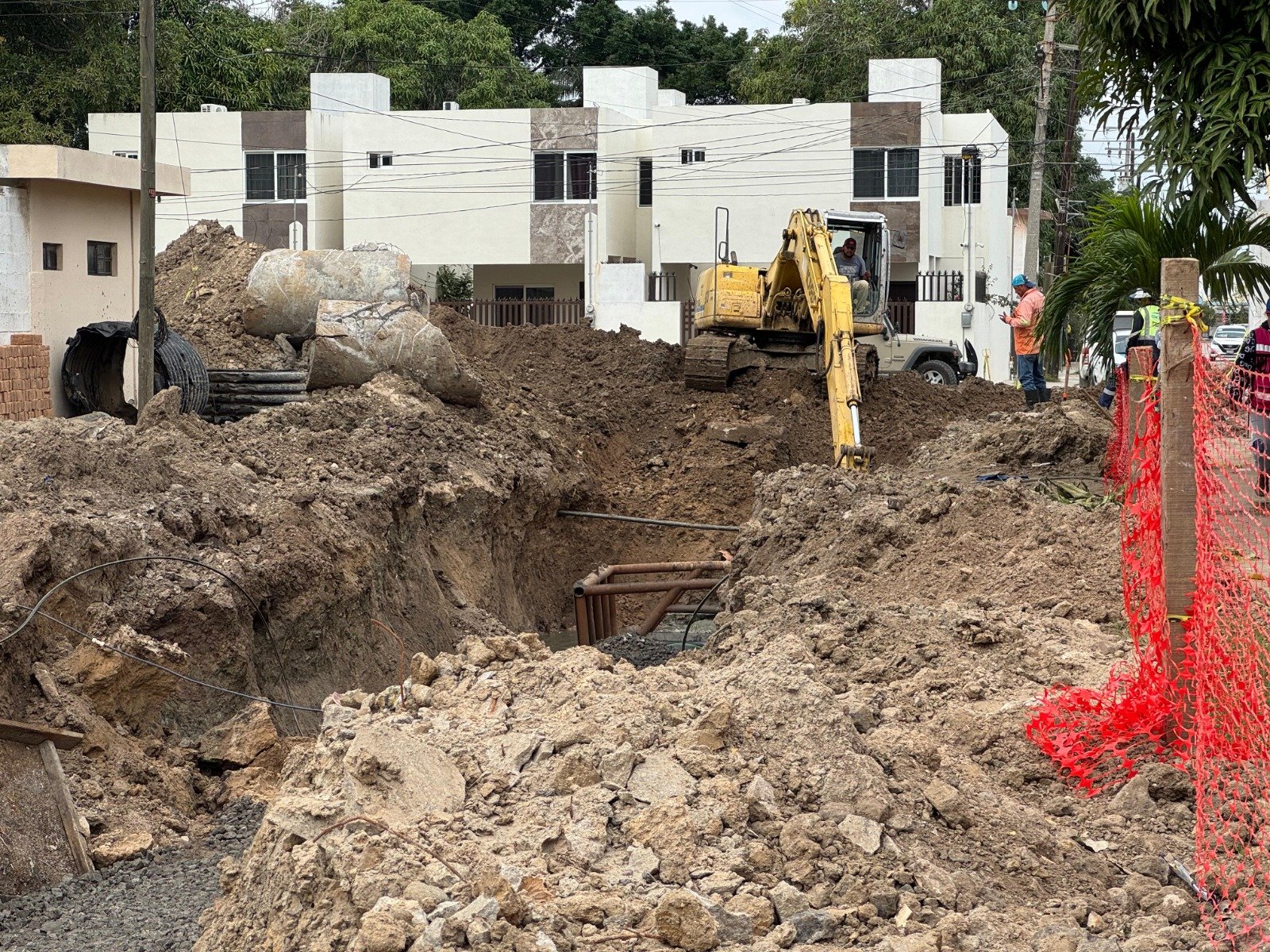 Las labores se concentran en la Calle B, entre las calles 1 y 2, donde se realiza el reemplazo de 100 metros lineales de tubería de 48 pulgadas que presentaba daños estructurales. Los trabajos se efectúan a una profundidad aproximada de 4 a 5 metros, bajo estrictas medidas de seguridad.