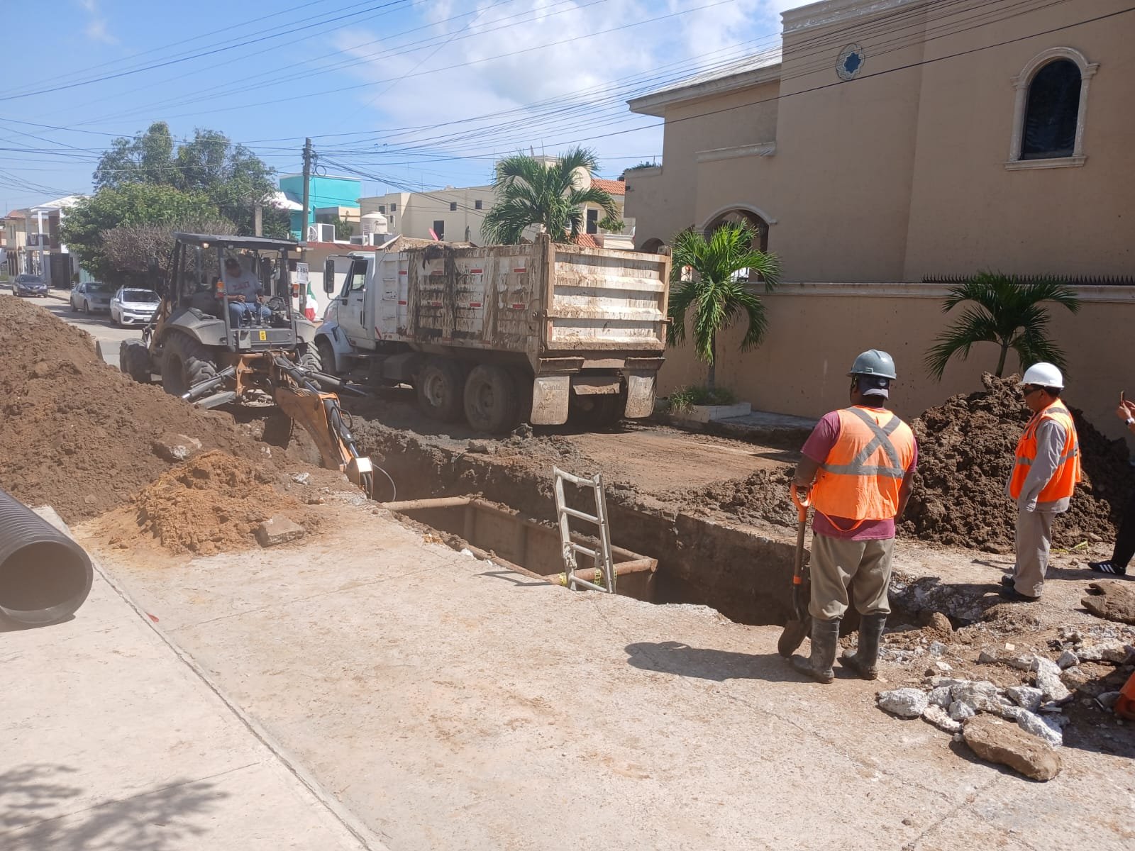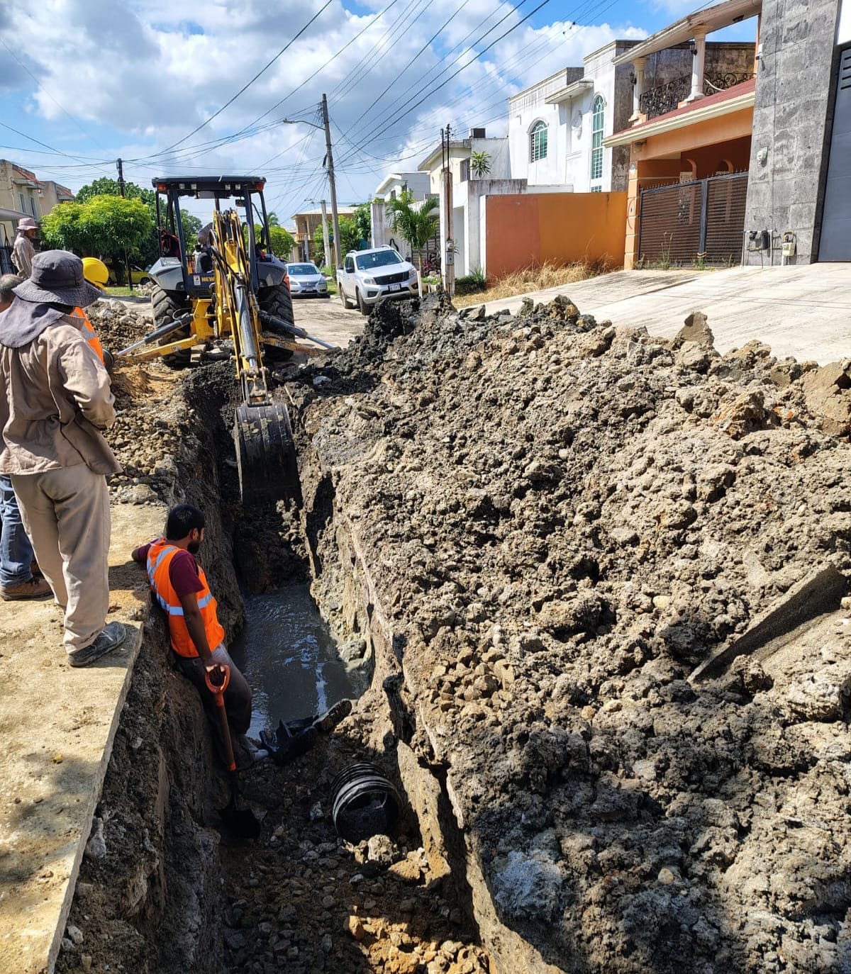 En la colonia Ampliación de la Unidad Nacional, se llevan a cabo labores de reposición de 100 metros lineales de un ducto general de drenaje de 12 pulgadas en la calle Matamoros, entre Sarabia y 16 de Septiembre.