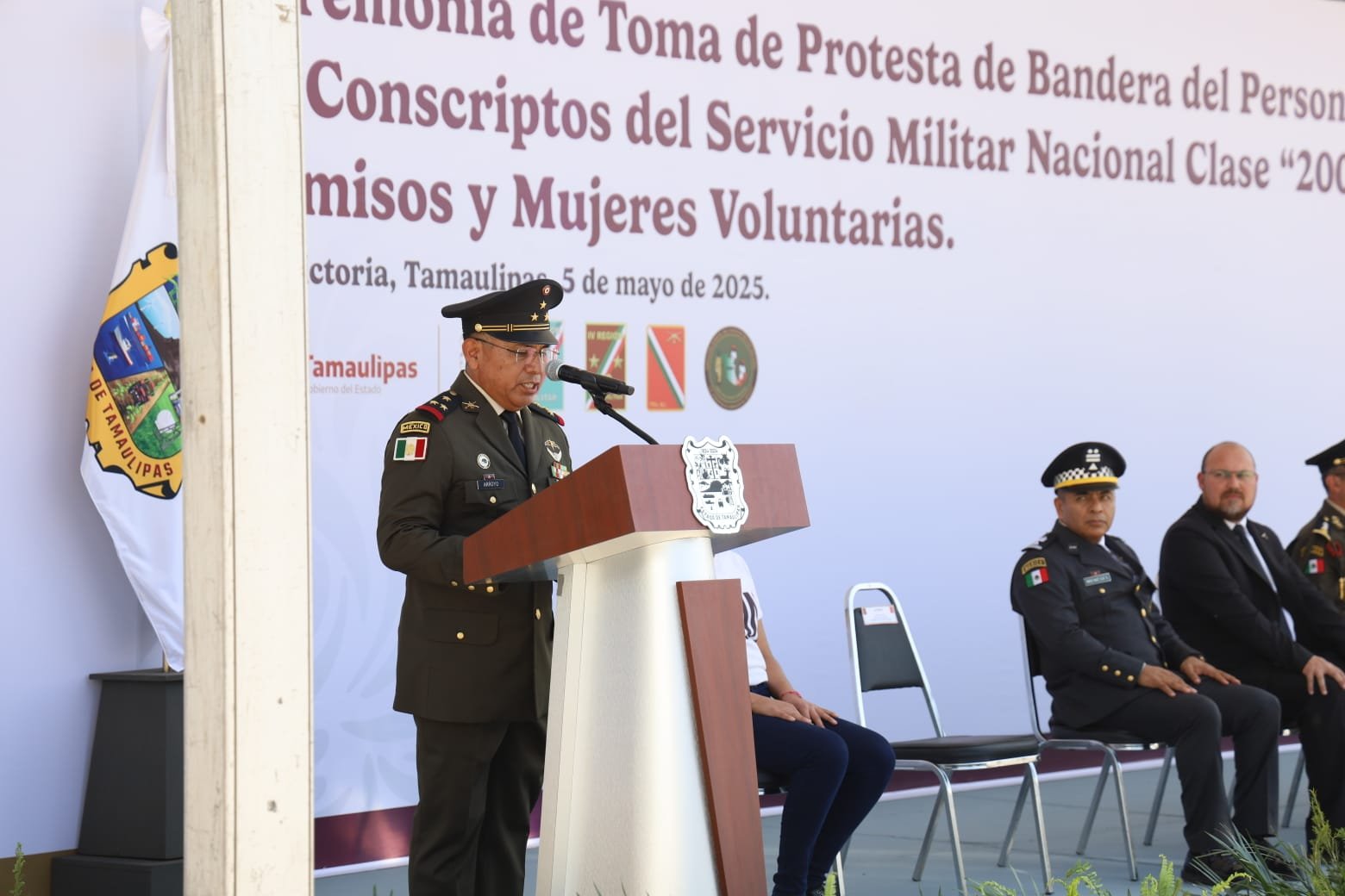 Ciudad Victoria, Tamaulipas. – En el marco de la conmemoración del 163 aniversario de la Batalla de Puebla, el secretario general de Gobierno, Héctor Joel Villegas González, acudió en representación del gobernador del estado, Américo Villarreal Anaya, a la ceremonia cívica de toma de protesta de bandera de las y los jóvenes del Servicio Militar Nacional, clase 2006, remisos y mujeres voluntarias, realizada en las instalaciones de la 48 Zona Militar.