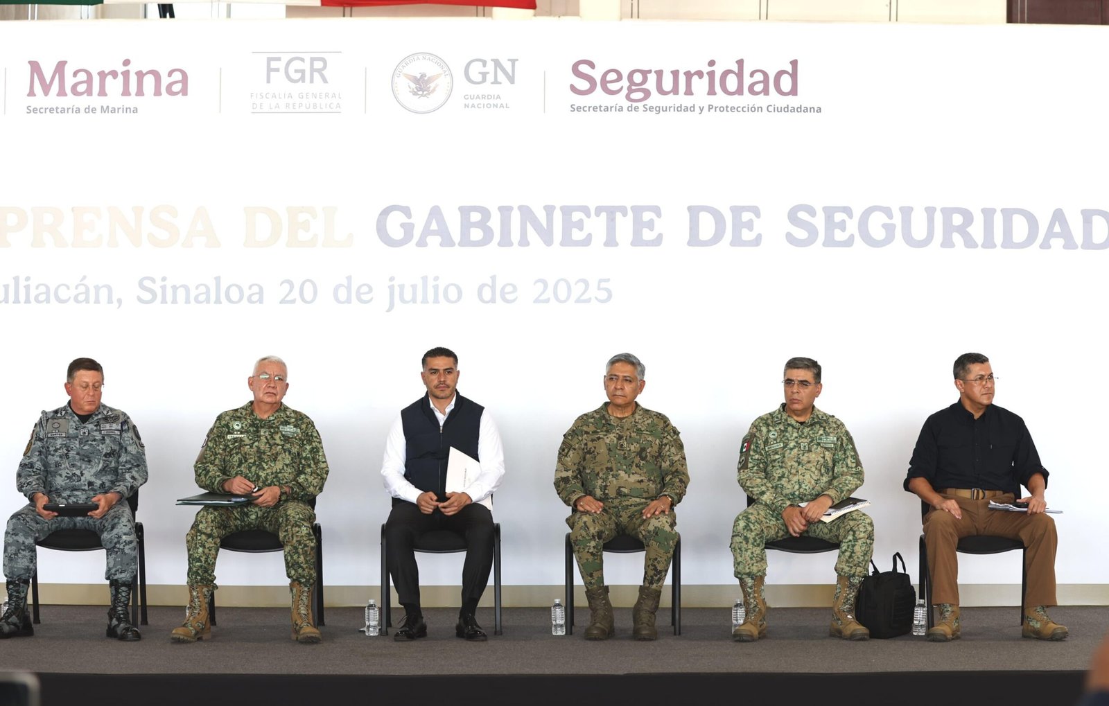 En la conferencia de prensa también estuvieron presentes el secretario de la Defensa Nacional, general Ricardo Trevilla Trejo; el secretario de Marina, almirante Raymundo Pedro Morales; el comandante de la Guardia Nacional, general Hernán Cortés Hernández; el secretario de Seguridad de Sinaloa, general Óscar Rentería Schazarino, y el Comandante de la Tercera Región Militar, general Guillermo Briseño Lobera.