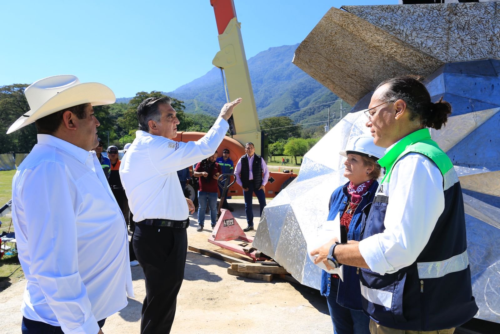 Al supervisar los trabajos de cimentación, donde se van colocando las diversas partes de acero que integran la obra de la maestra Elizabeth Pesquera, el gobernador dio a conocer que la escultura tendrá dos piezas de bronce que conforman sus ojos, las cuales han sido bendecidas por el Papa León XIV.
