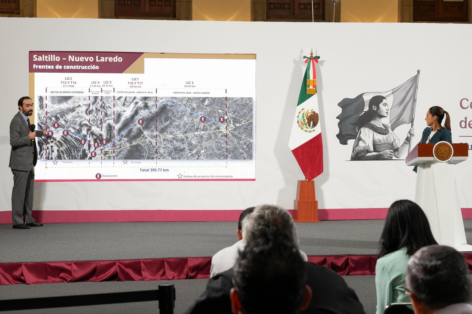 La Presidenta Claudia Sheinbaum Pardo, informó que en septiembre inicia la construcción de los trenes Querétaro–Irapuato y Saltillo–Nuevo Laredo, cuyas licitaciones serán asignadas en agosto, además de que mañana 10 de julio se licitarán 15 trenes para el México–Pachuca, lo que demuestra que se están recuperando las capacidades del Estado para transportar al pueblo de México en ferrocarril.