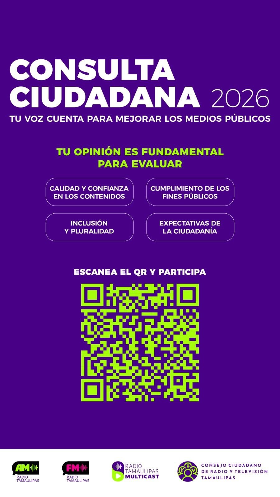 La Dra. Olga Nacori López Hernández, presidenta del Consejo Ciudadano del SERTT, informó que esta consulta se realiza mediante un cuestionario digital de participación voluntaria y anónima, que estará disponible durante tres semanas y está dirigida a personas mayores de 15 años residentes en Tamaulipas que consumen o podrían consumir los contenidos de radio y multimedia del sistema estatal.