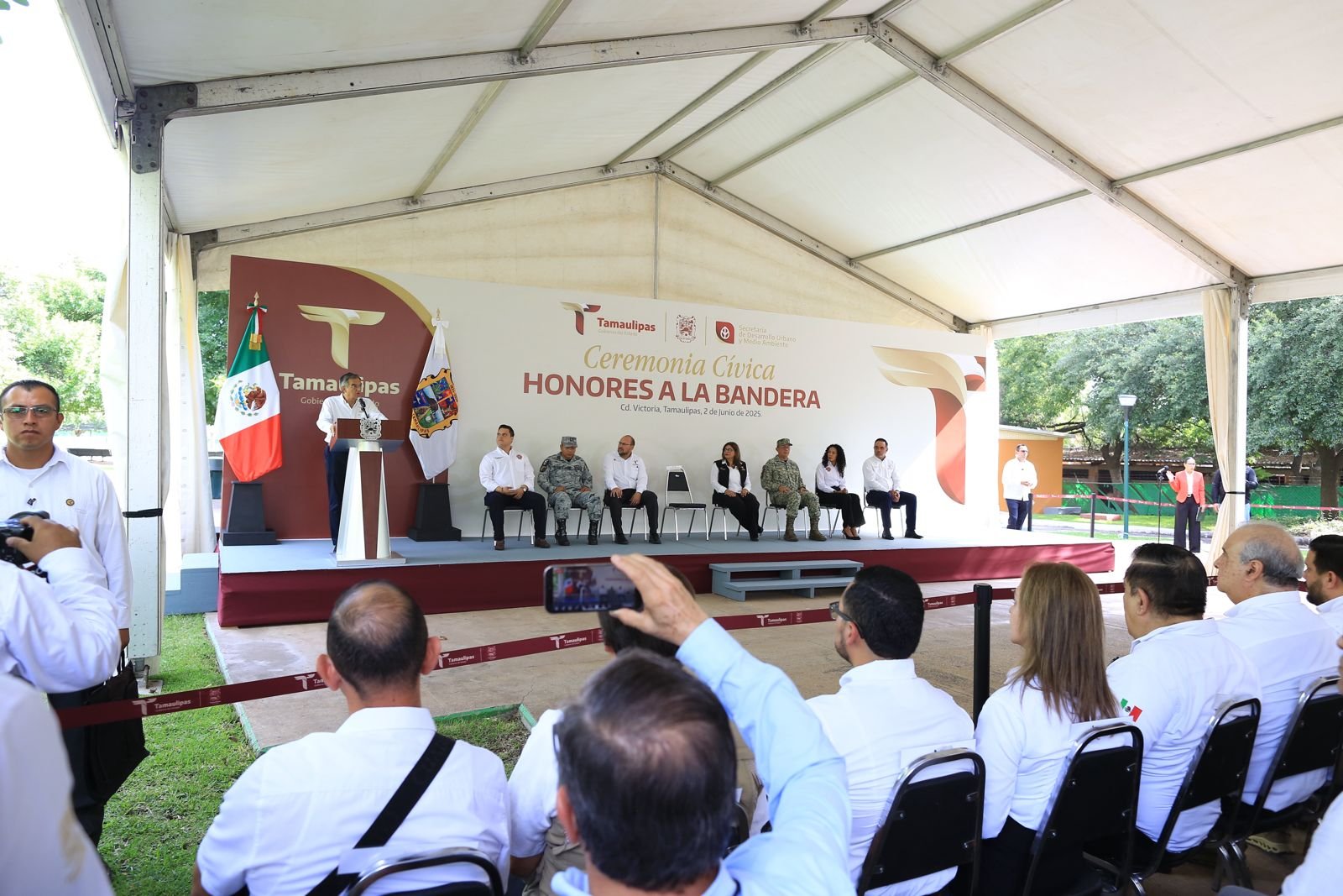 En la ceremonia también se contó con la presencia de: Héctor Joel Villegas González, secretario general de Gobierno; diputado Humberto Prieto Herrera, presidente de la Junta de Gobierno del Congreso del Estado; diputada Cynthia Jaime Castillo, presidenta de la Mesa Directiva del Congreso; magistrado Hernán De la Garza Tamez, presidente del Supremo Tribunal de Justicia; general Enrique García Jaramillo, comandante de la 48 Zona Militar, y el inspector jefe Fernando Meneses Martínez, en representación de la Coordinación Estatal de la Guardia Nacional, así como funcionarios estatales y representantes de instituciones educativas, ambientales y sociales.