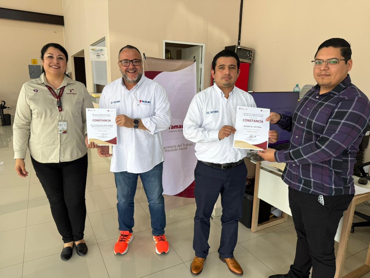 Enero 27 de 2026, Ciudad Victoria, Tamaulipas.- Como parte de las acciones permanentes para fortalecer entornos laborales justos y respetuosos, la Secretaría del Trabajo y Previsión Social de Tamaulipas (STPS) llevó a cabo la Sesión Informativa “Trabajo Digno”, dirigida a gerentes de la Agencia Automotriz Suzuki, en el municipio de Ciudad Victoria.