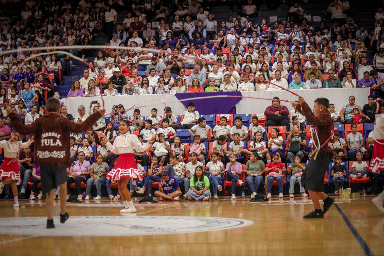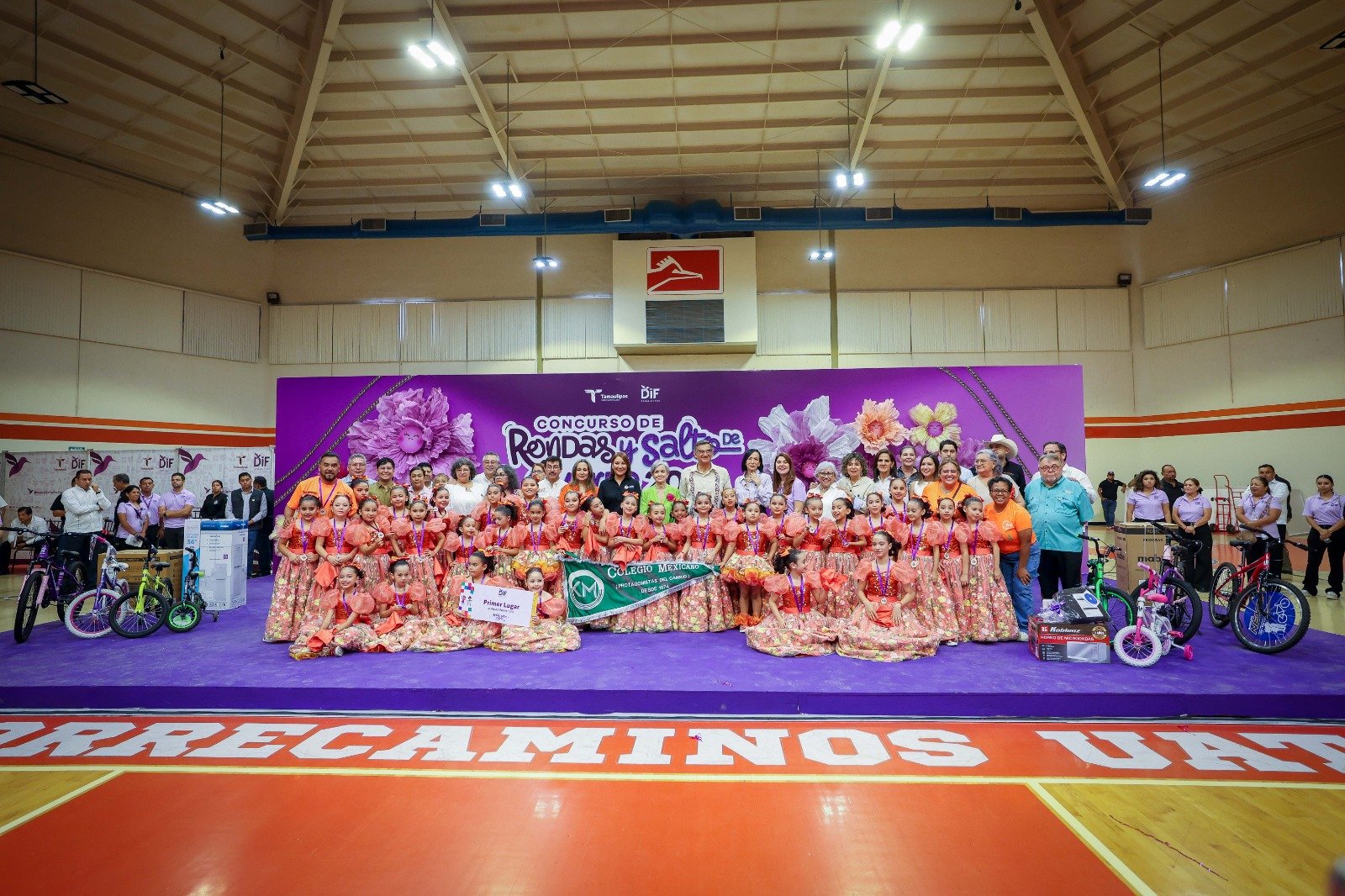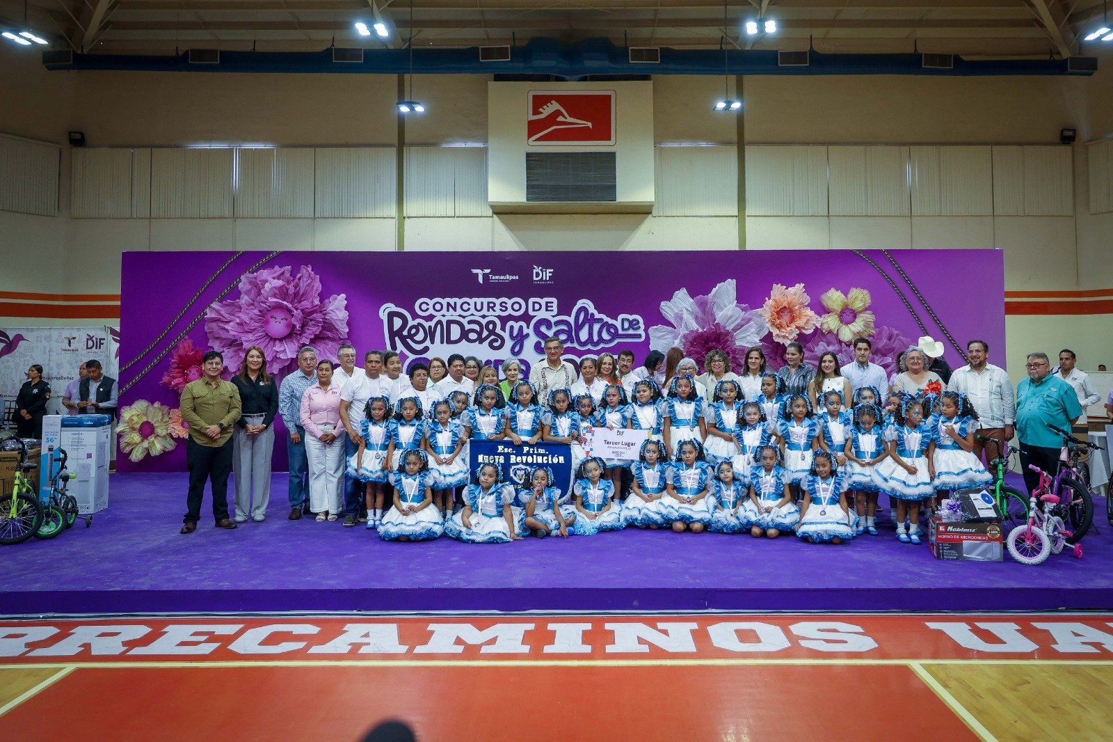 Ciudad Victoria, Tamaulipas. El gobernador Américo Villarreal Anaya y la presidenta del Sistema DIF Tamaulipas, la doctora María de Villarreal, premiaron a las y los ganadores de la final estatal del Concurso de Rondas Infantiles y Salto de Cuerda 2025, evento que se desarrolló en las instalaciones del Gimnasio Multidisciplinario de la UAT en esta capital, con la participación de alumnos de escuelas de las regiones norte, centro y sur del estado.