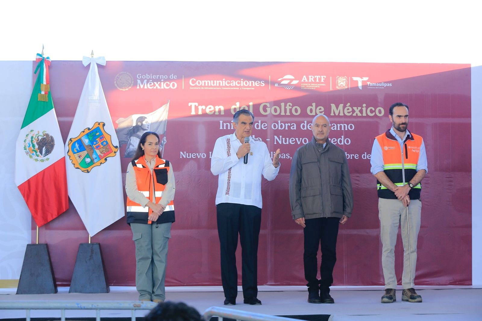 Acompañado por Jesús Antonio Esteva Medina, secretario de Infraestructura, Comunicaciones y Transportes, y Andrés Lajous Loaeza, titular de la Agencia Reguladora del Transporte Ferroviario, el mandatario tamaulipeco dio la bienvenida a esta obra de gran calado, que permitirá la generación de 10 mil 922 empleos directos y 32 mil 766 empleos indirectos.