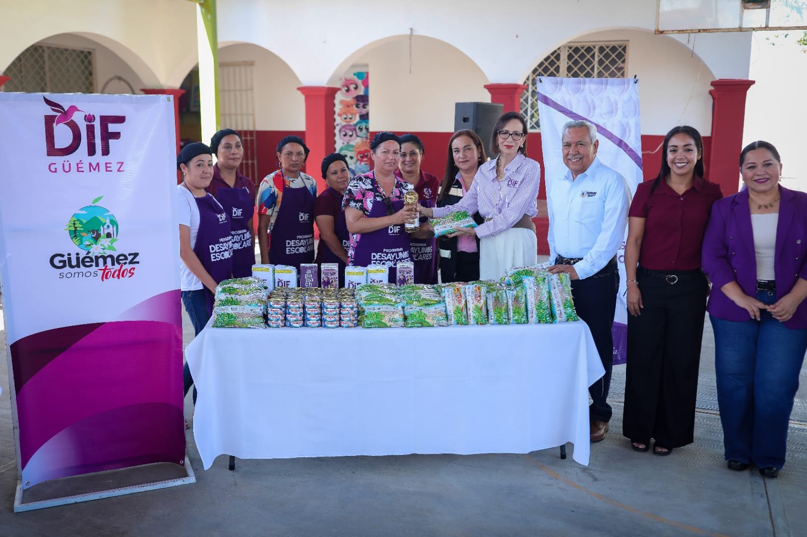 Güémez, Tamaulipas.- El Sistema para el Desarrollo Integral de la Familia de Tamaulipas que preside la doctora María de Villarreal, realizó la entrega simbólica de insumos alimentarios que enmarcaron el arranque del programa Desayunos Escolares para el ciclo escolar 2025-2026.