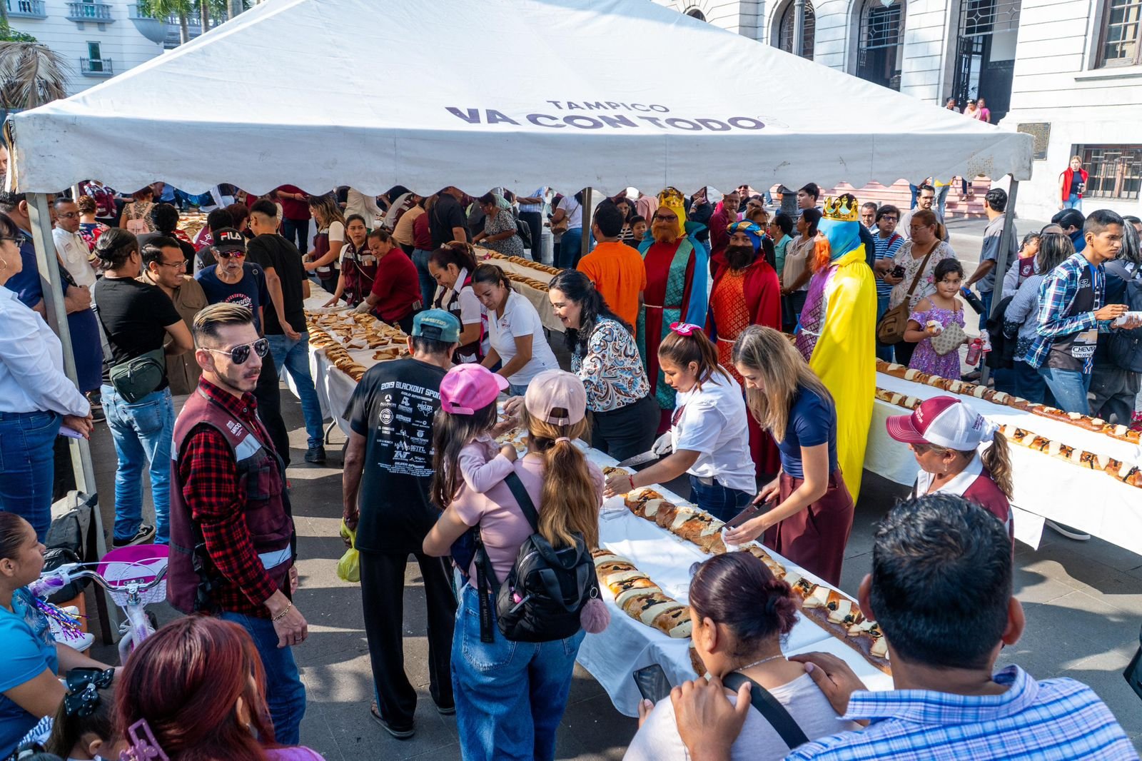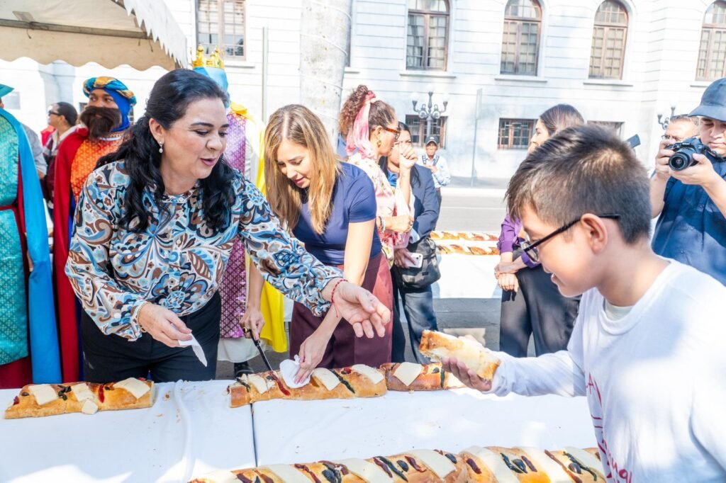 Mónica Villarreal, acompañada de síndicos, regidores, directores y secretarios, detalló que los festejos de Día de Reyes, incluyeron la instalación en la plaza de armas, de una monumental rosca de más de 90 metros que fue compartida con más de 600 ciudadanos de la zona centro; además de emprender una campaña de donación de cascos a motociclistas en el exterior de las Dirección de Tránsito y Vialidad, donde junto a elementos de la corporación, distribuyó este esencial equipo de seguridad personal, acompañado de una rosca de reyes.
