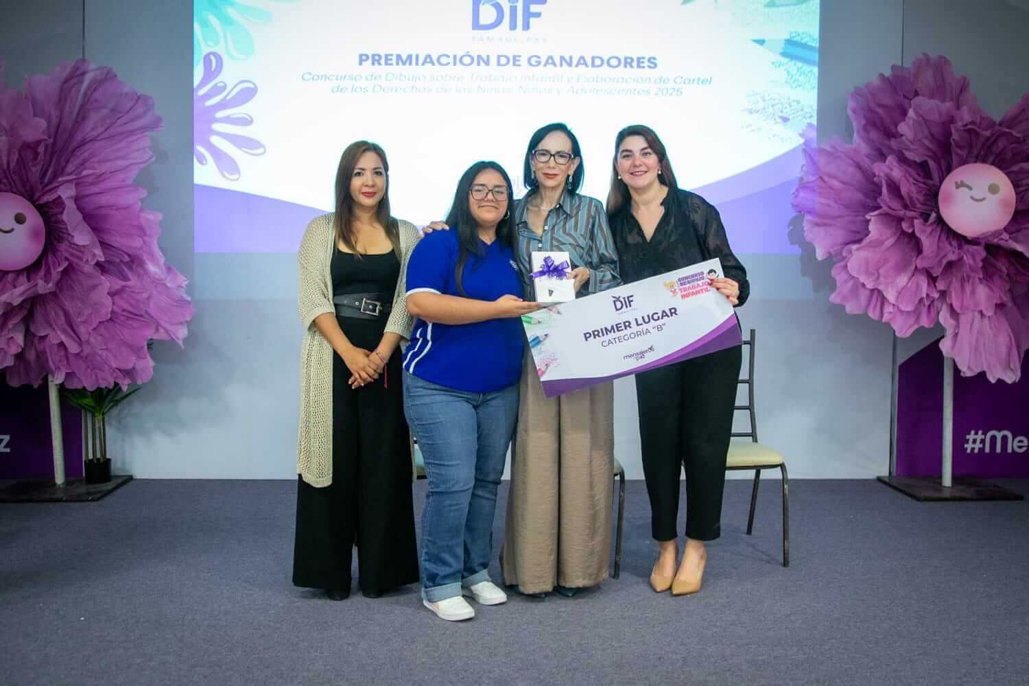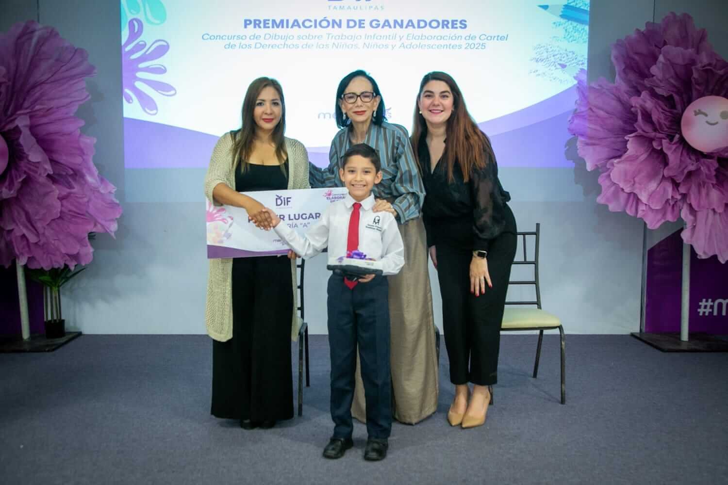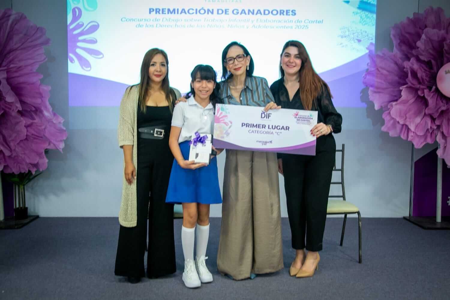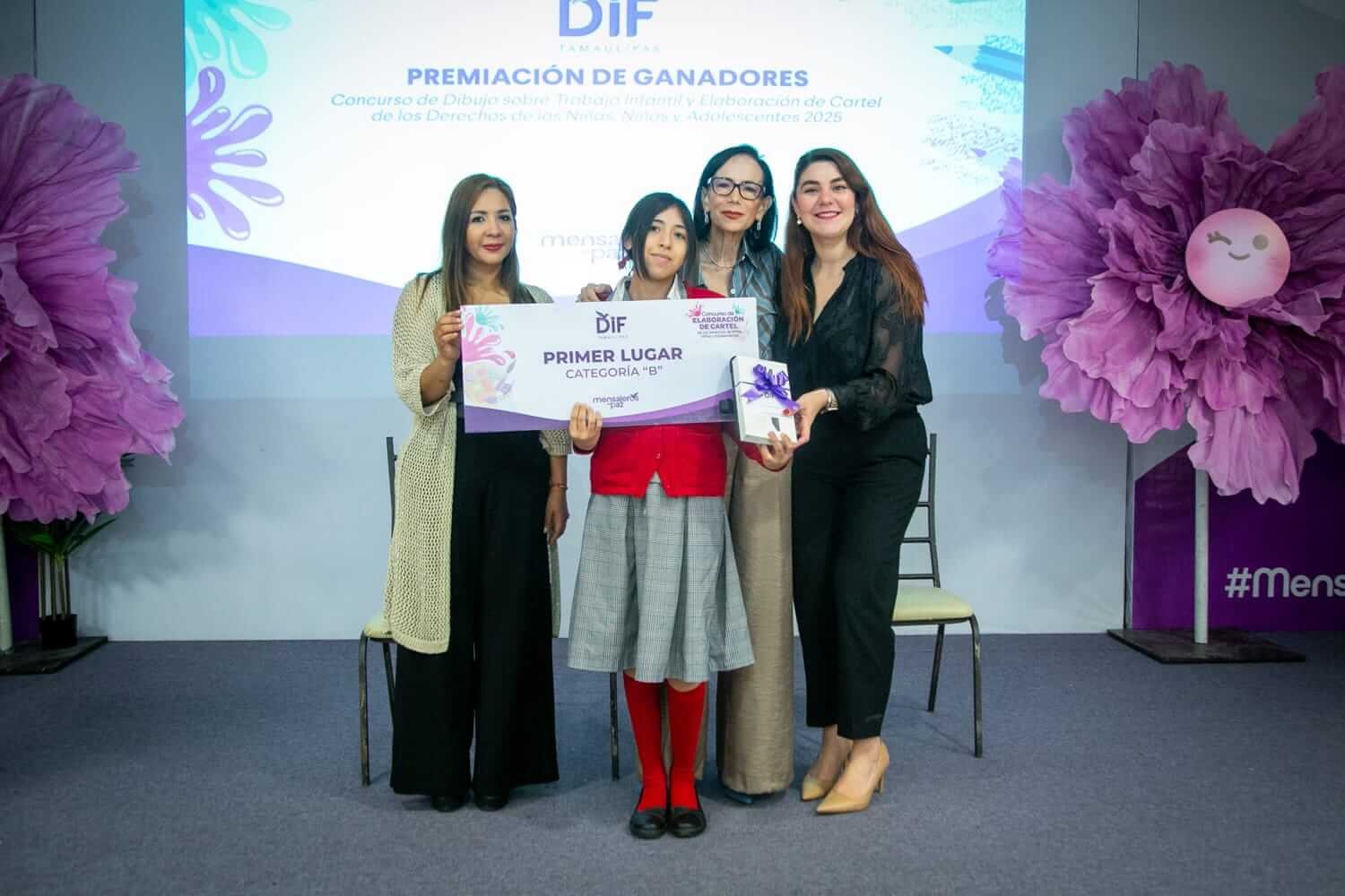 En el concurso de elaboración de carteles sobre los derechos de las niñas, niños y adolescentes se premió, en la categoría “A” (alumnos de educación primaria), a Jaziel López Bernal, de Gustavo Díaz Ordaz, con el primer lugar; Giselle Luz Reyes, de Nuevo Laredo, con el segundo lugar; y María Fernanda Narváez Chávez, de Aldama, con el tercer lugar.