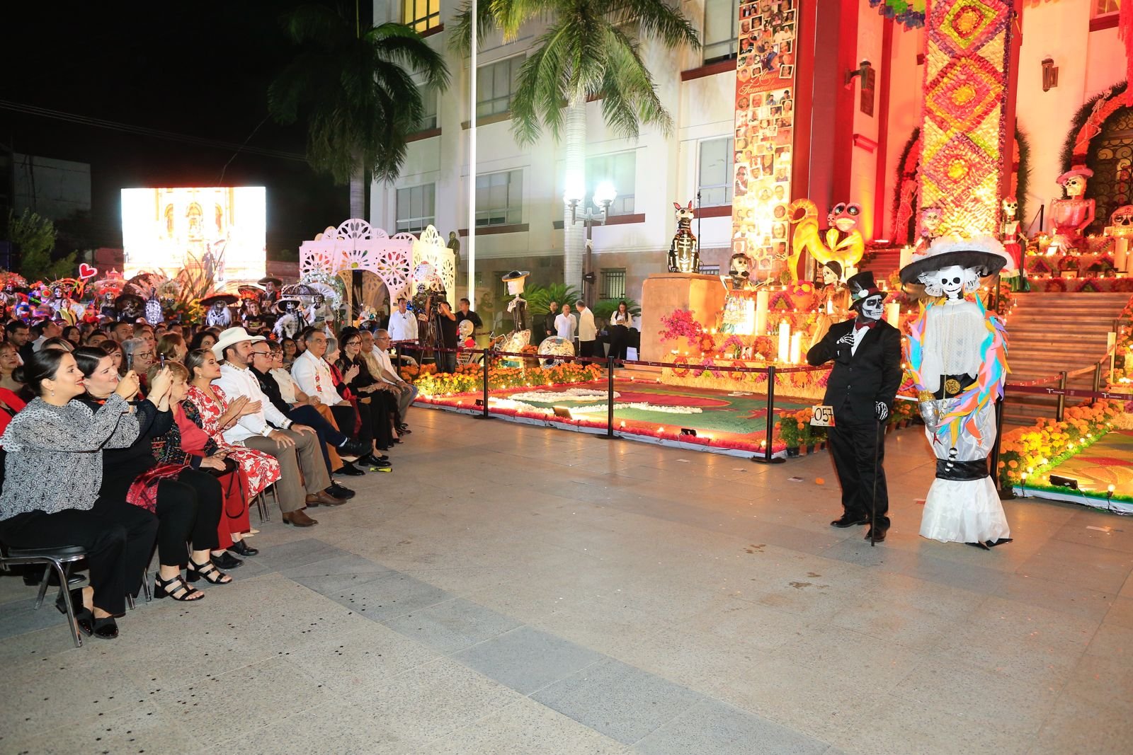 Noviembre 02 de 2025, Ciudad Victoria, Tamaulipas.- En un ambiente impregnado por el aroma de la flor de cempasúchil, el pan de muerto y las luces de las velas, el gobernador Américo Villarreal Anaya y la presidenta del Sistema DIF Estatal, María de Villarreal presidieron la premiación del concurso estatal de catrinas y catrines “Almas Tamaulipecas” y la muestra del altar monumental del Día de Muertos en las escalinatas de Palacio de Gobierno .