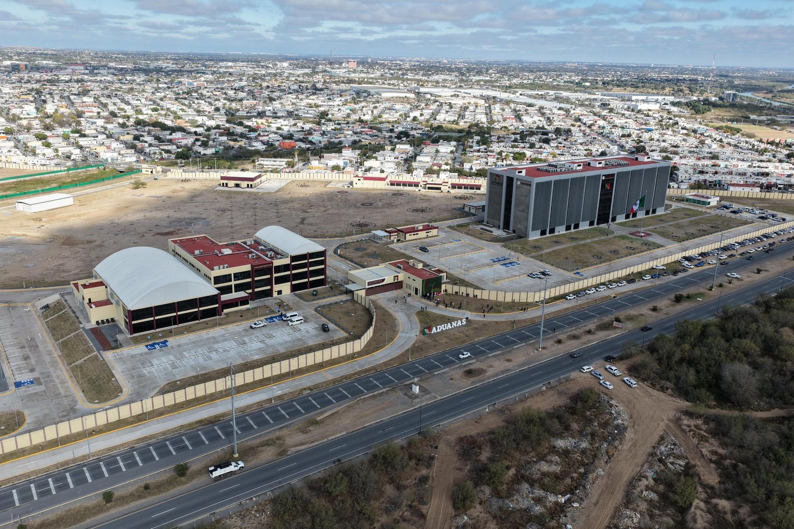 Se trató de una obra desarrollada desde una visión integral en 29 hectáreas con 320 mil metros cuadrados de construcción, generando más de 3 mil 700 empleos directos y 7 mil indirectos. Detalló que el edificio principal tiene capacidad de mil 100 personas y cuenta con 600 viviendas para trabajadores y sus familias, así como espacios de recreación. Agregó que a esta obra se suma la construcción, por parte de la Defensa Nacional, de siete secciones aduaneras en Baja California, 12 en Sonora, nueve en Chihuahua, cuatro en Coahuila y 16 en Tamaulipas, que concluyeron en 2024 y que están equipadas con aparatos de última tecnología como detectores de mercancía para evitar contrabando, laboratorios móviles de hidrocarburos, rayos X móviles, ferroviarios, vehiculares y para maletas.