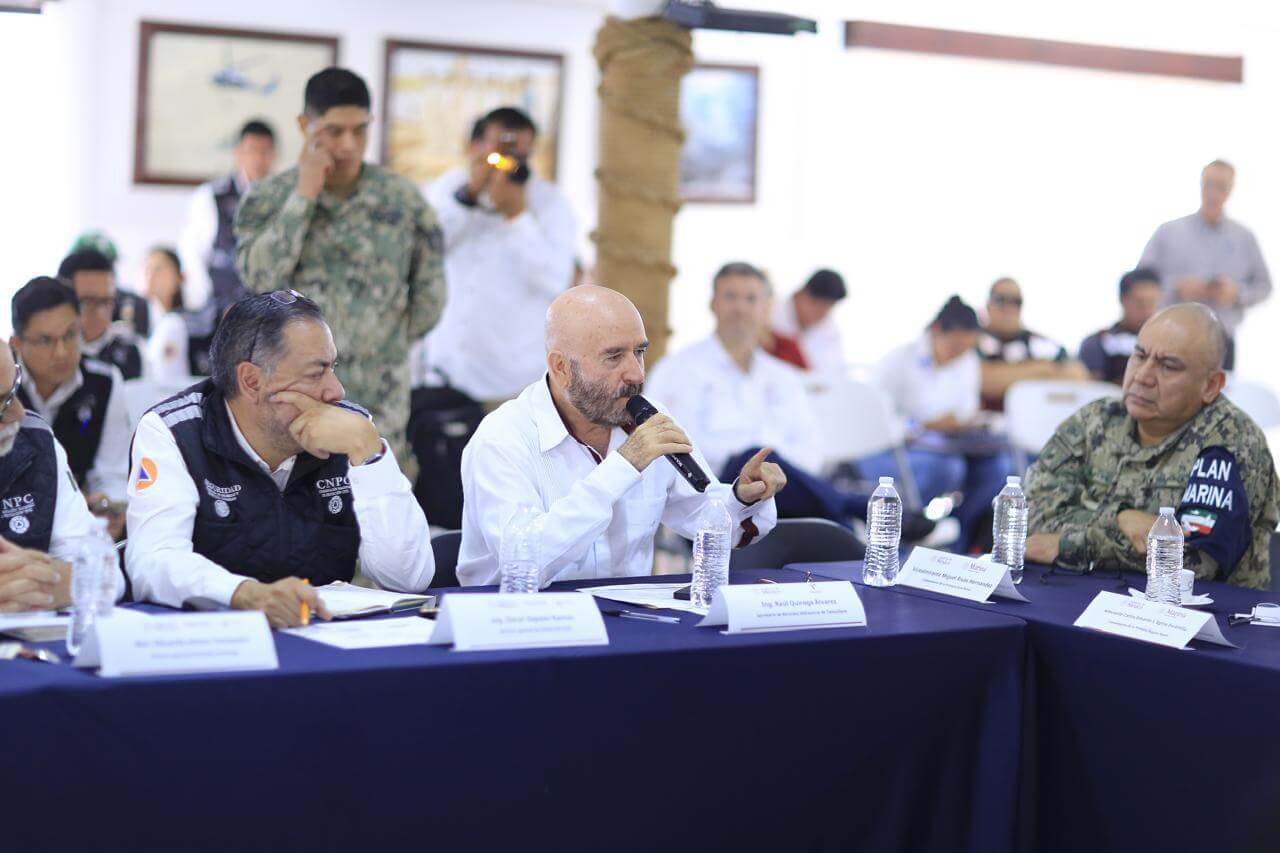 Al presidir la reunión de coordinación en el puesto de mando de la Primera Zona Naval, el gobernador Américo Villarreal Anaya atendió las peticiones de la y los alcaldes y dispuso el uso del helicóptero de Protección Civil para llevar paquetes alimentarios y atención médica a población afectada en las márgenes del Tamesí, en Altamira, así como la rehabilitación de caminos rurales en cuanto la situación lo permita, en el municipio de González.