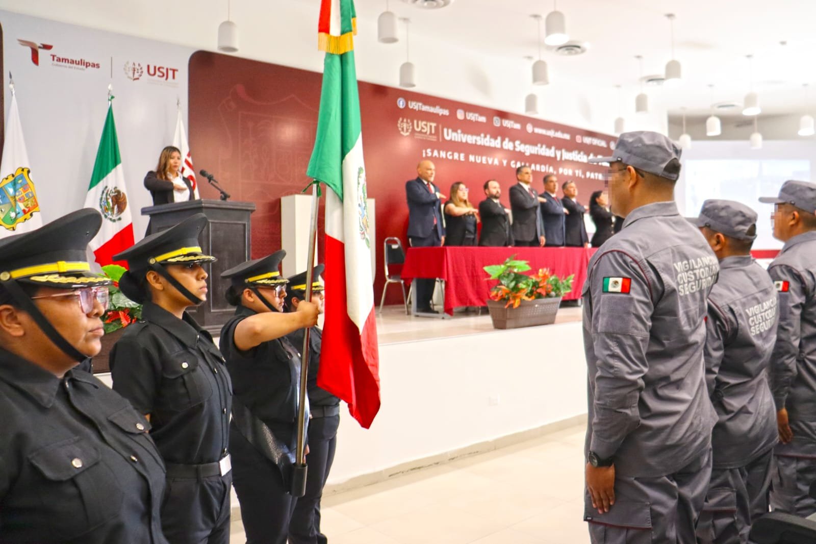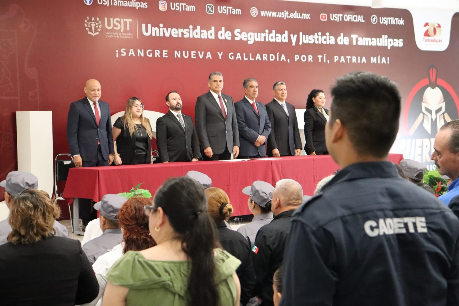 La graduación celebrada en el Auditorio de la USJT contó con la presencia del secretario de Seguridad Pública de Tamaulipas, Carlos Arturo Pancardo Escudero, quien reiteró el compromiso de la dependencia a su cargo de transformar el sistema de seguridad y justicia con la firmeza de los valores, la aplicación de las mejores prácticas y el respeto a los derechos humanos, para proteger y servir a la ciudadanía.