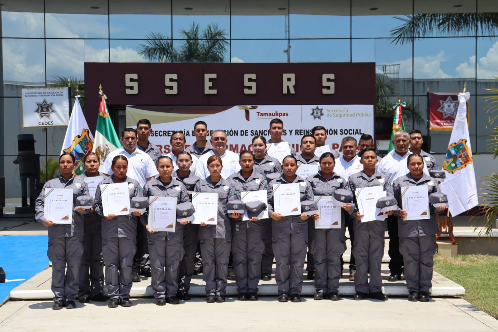 Ciudad Victoria, Tamaulipas.- La Secretaría de Seguridad Pública de Tamaulipas (SSPT) realizó la ceremonia de clausura del Curso de Formación Inicial para Policía Penitenciaria, en la que un grupo de 19 mujeres y hombres concluyó satisfactoriamente 12 semanas de capacitación intensiva orientada a fortalecer el sistema penitenciario de la entidad.