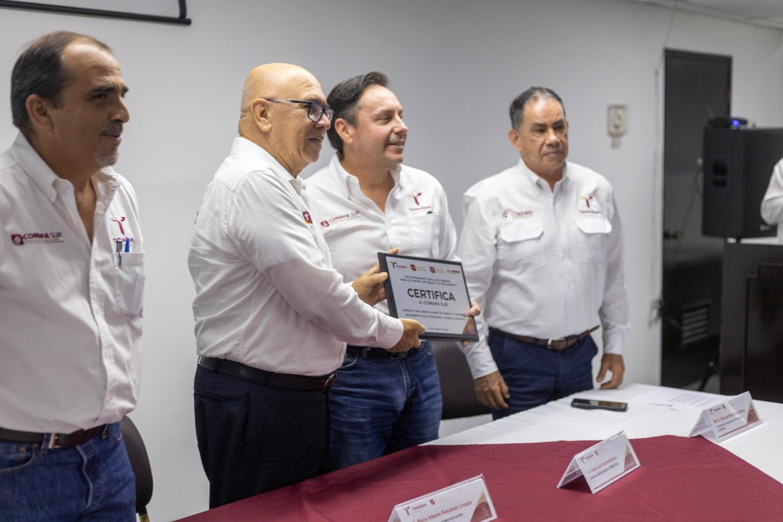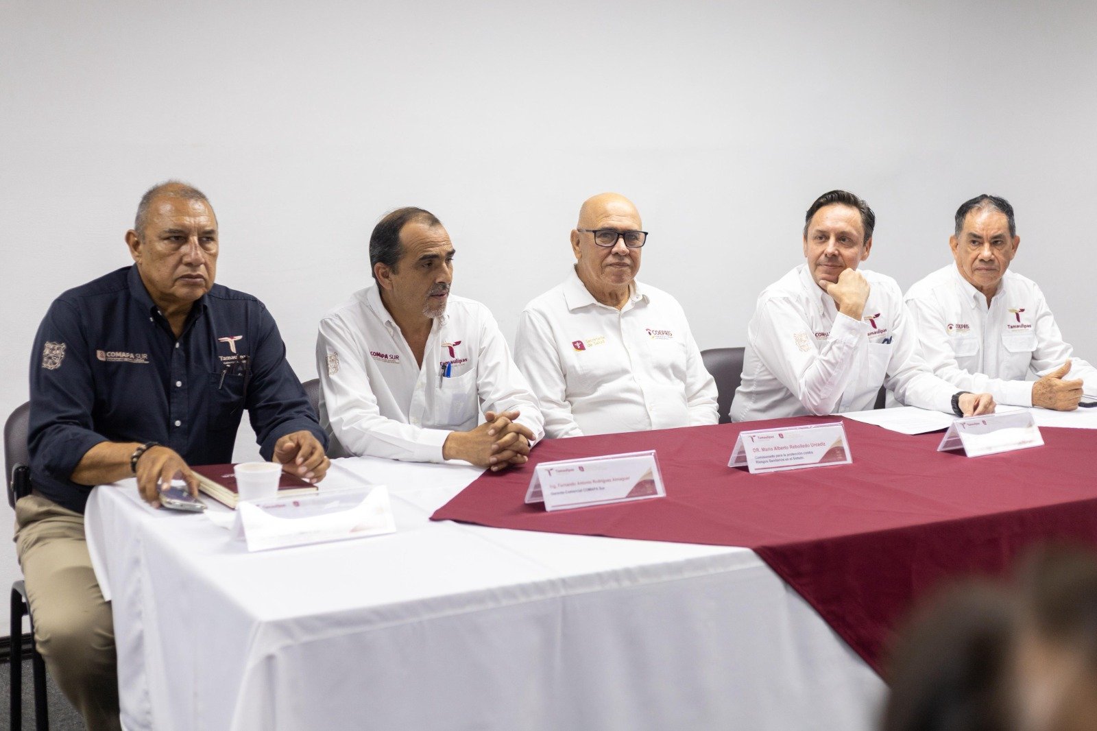 En el evento, estuvieron presentes, el Lic. Sergio Luis Villarreal Brictson, gerente administrativo, en representación del Mtro. Francisco José González Casanova, gerente general; el Dr. Mario Alberto Rebolledo Urcadiz, comisionado estatal para la Protección contra Riesgos Sanitarios; el M.V.Z. Nicolás Berumen Ávalos, coordinador de la COEPRIS Tampico; el Ing. Fernando Rodríguez Almaguer, gerente comercial; el Ing. Humberto Olivo Quintero, gerente técnico, así como invitados especiales de la COEPRIS Estatal y de COMAPA Sur.
