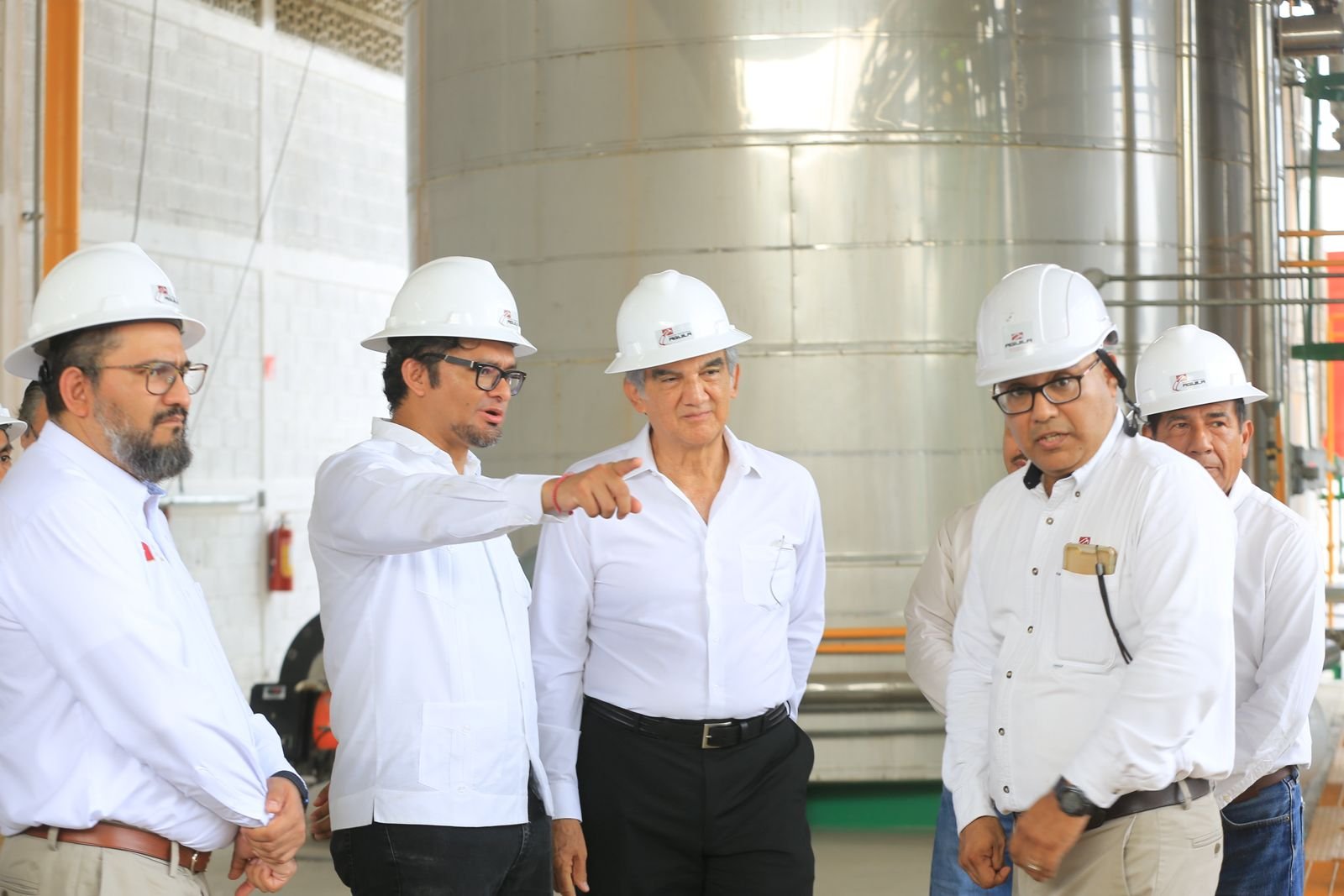 Altamira, Tamaulipas.- El gobernador Américo Villarreal Anaya efectuó un recorrido por las instalaciones de la planta de la empresa Green Bauen, filial del Grupo Industrial Águila, en la cual se procesan desechos plásticos permitiendo la generación de queroseno, parafinas, gasolina y diesel, utilizando tecnología cien por ciento tamaulipeca.