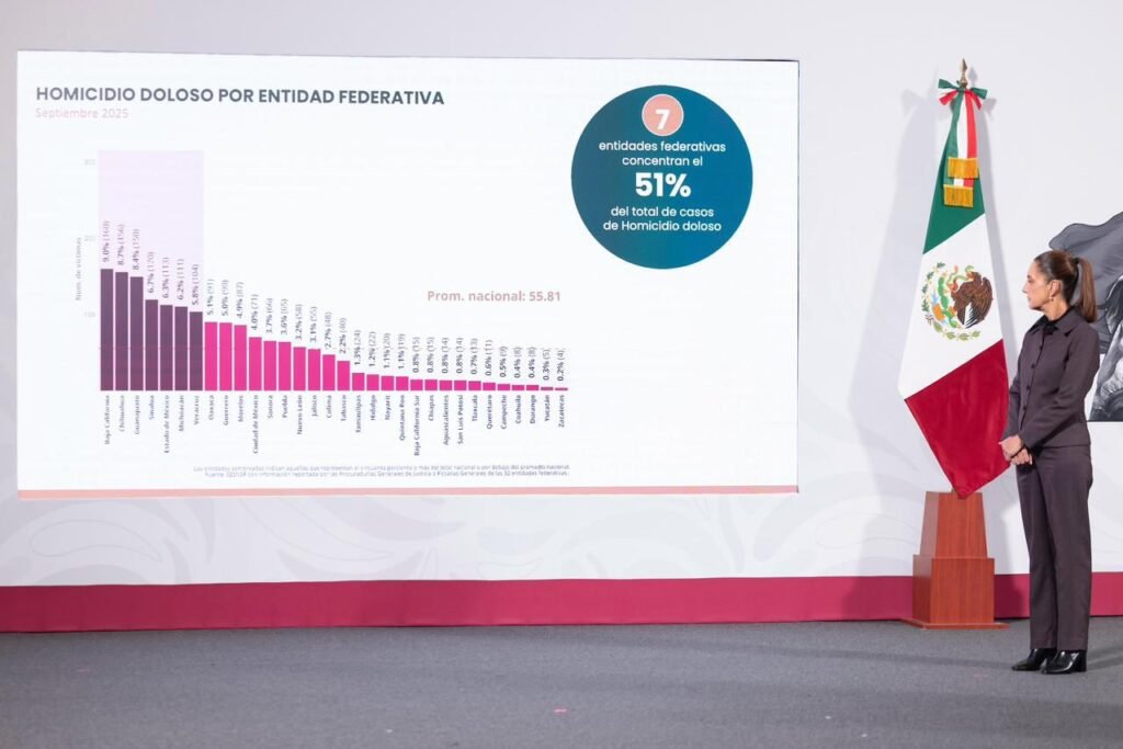 La Presidenta Claudia Sheinbaum Pardo resaltó que, a un año de gobierno, la reducción de 32 por ciento en los homicidios dolosos, entre septiembre de 2024 y septiembre de 2025, es muy significativa ya que representa 27 personas que no fallecen diariamente y lo atribuyó a la implementación de los cuatro ejes de la Estrategia Nacional de Seguridad.
