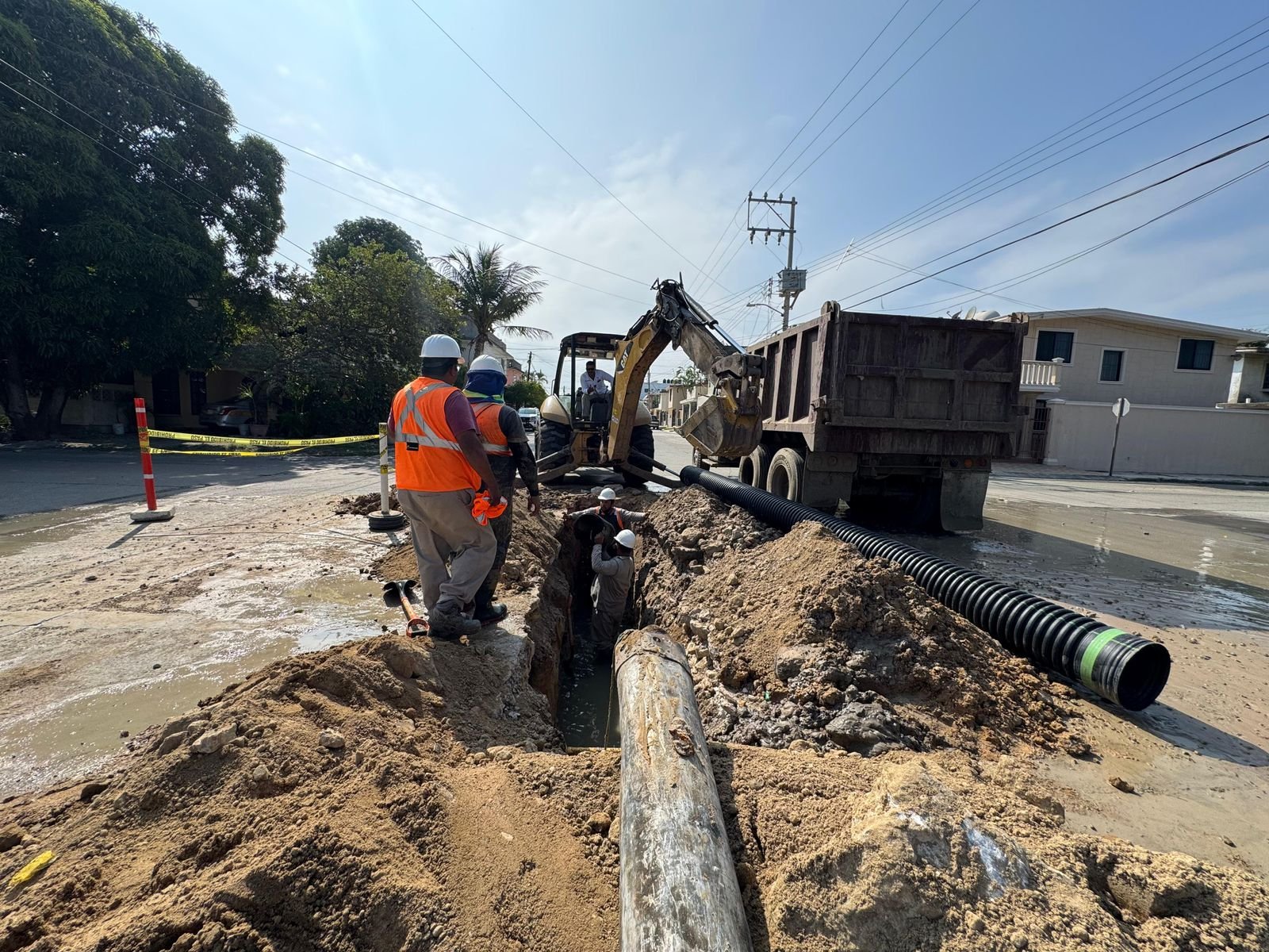 En seguimiento al programa de mejora continua de la infraestructura hidráulica, COMAPA SUR ejecuta la rehabilitación de la línea general de drenaje en la calle 5 de Febrero, entre Benito Juárez y Zaragoza, en la colonia Ampliación de la Unidad Nacional de Ciudad Madero, una acción que busca elevar las condiciones sanitarias y la seguridad de las familias del sector.