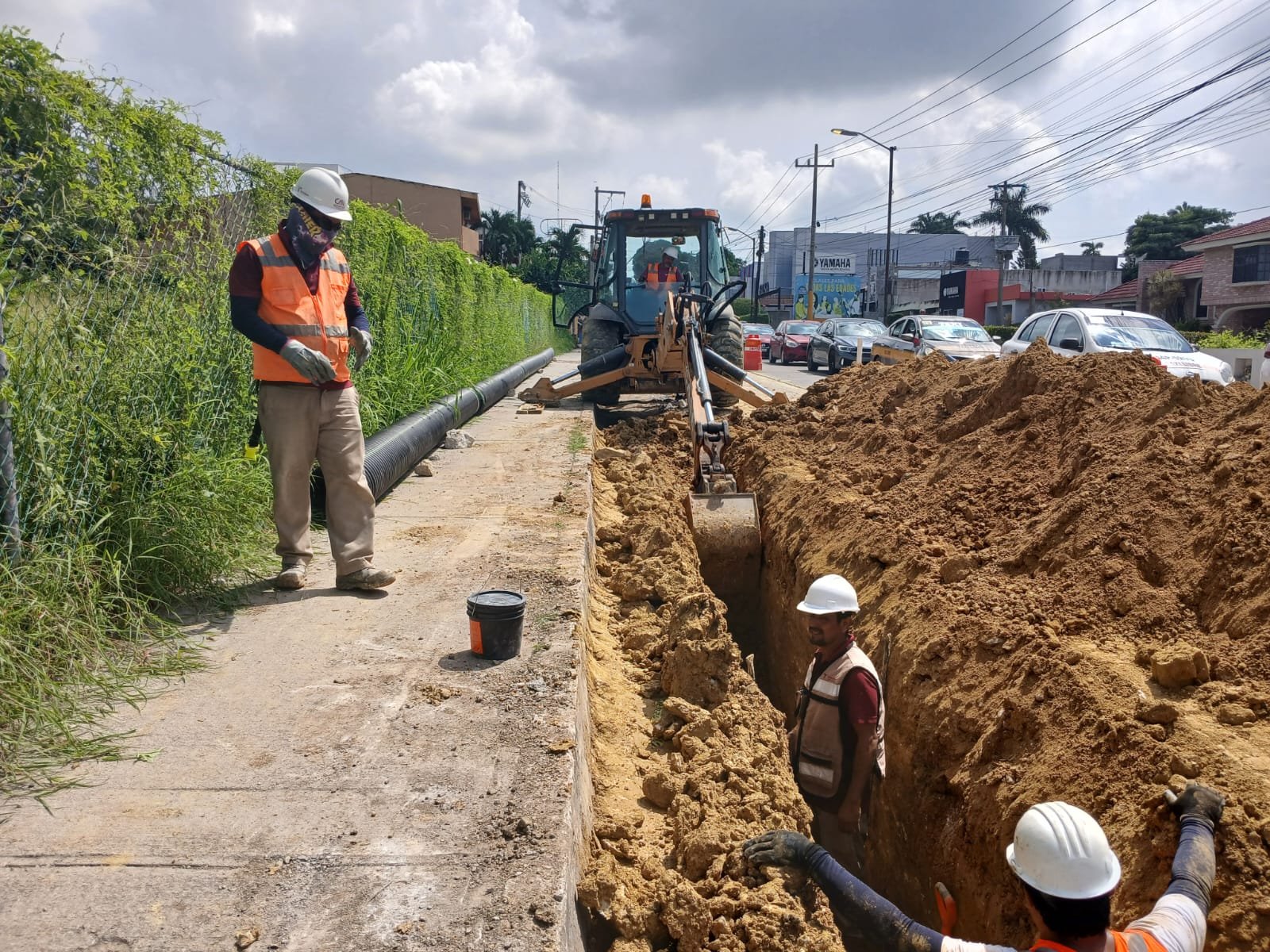 COMAPA SUR trabaja de manera acelerada en la reposición de una línea general de drenaje en la calle Agua Dulce de la colonia Vista Hermosa, uno de los sectores habitacionales y comerciales más importantes del municipio.