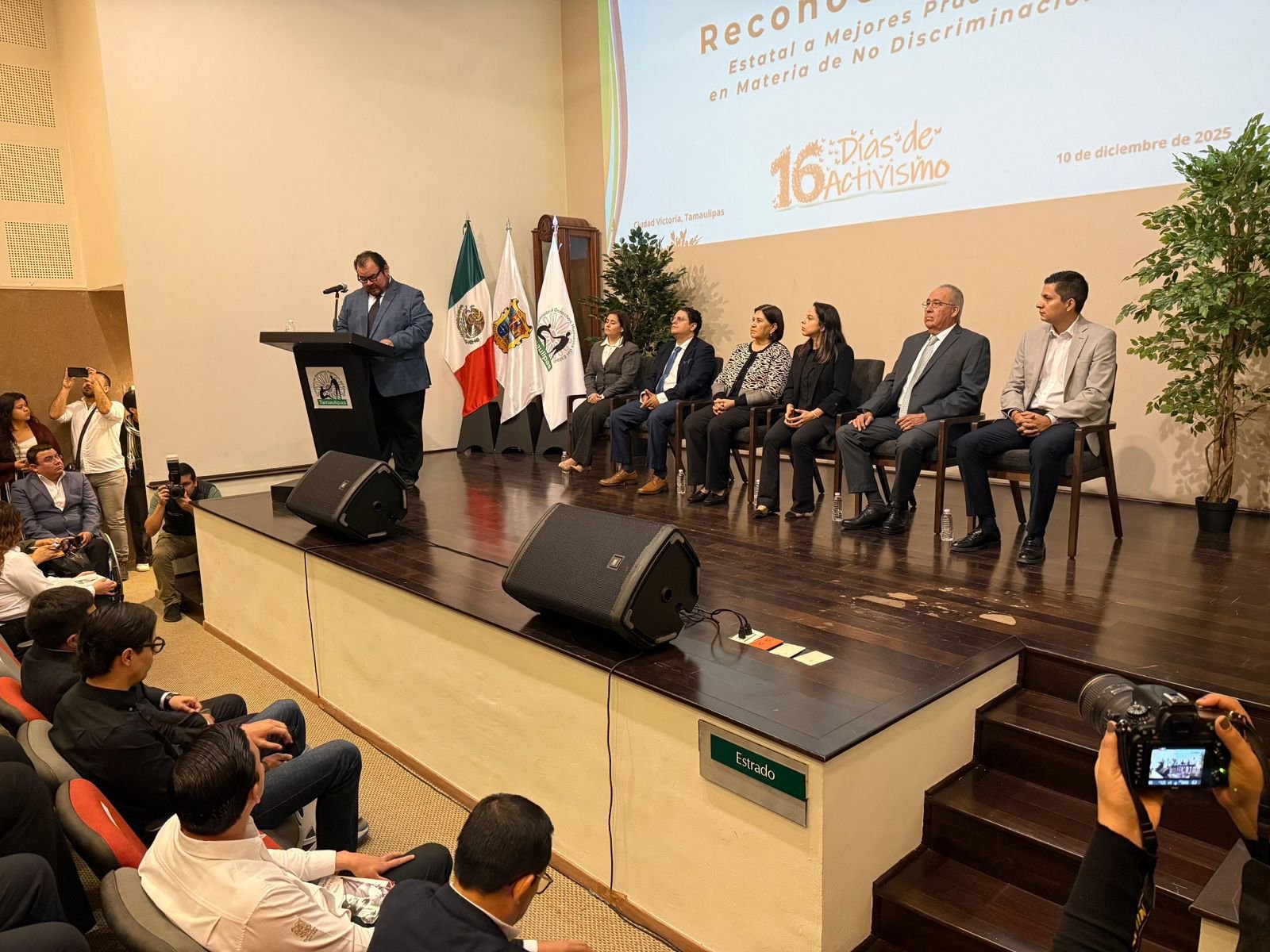 Diciembre 13 de 2025, Ciudad Victoria, Tamaulipas.- La Secretaría del Trabajo y Previsión Social participó en el Reconocimiento Estatal a Mejores Prácticas de No Discriminación, durante la ceremonia realizada en el Auditorio del Archivo Histórico de Tamaulipas, en Ciudad Victoria.