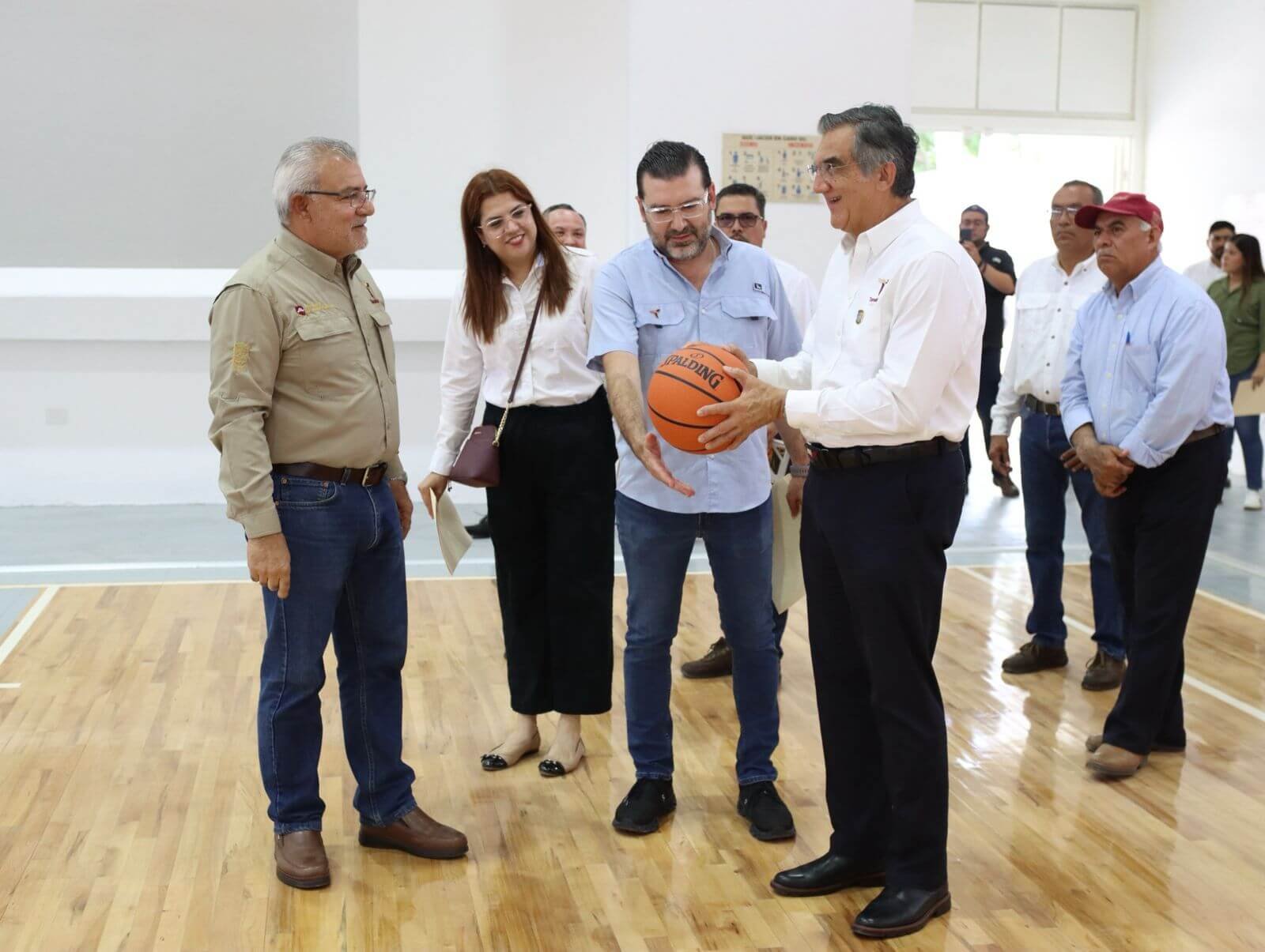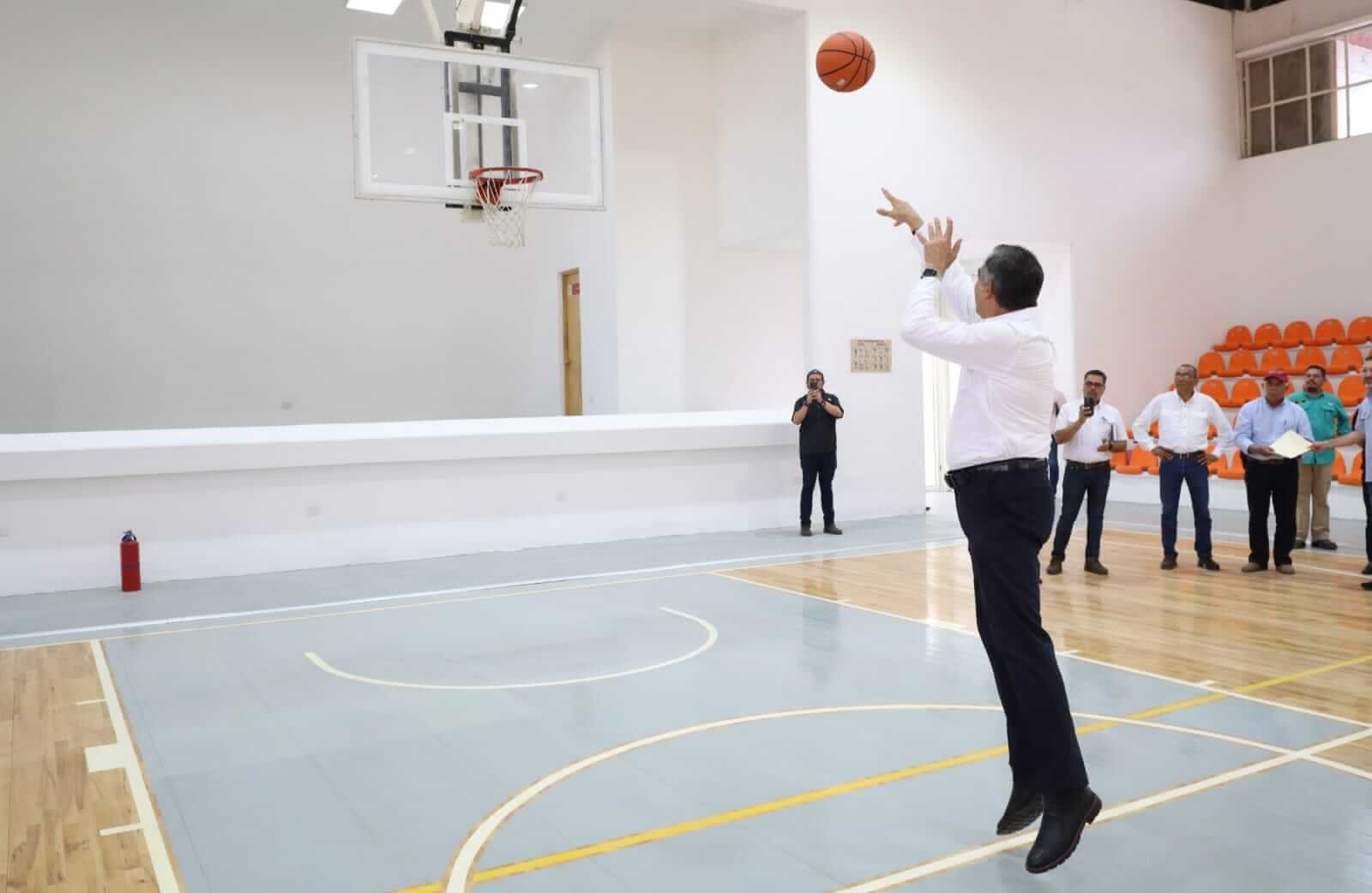 En un momento de su recorrido, el mandatario estatal realizó un tiro a la canasta en las nuevas canchas de basquetbol y logró encestar.