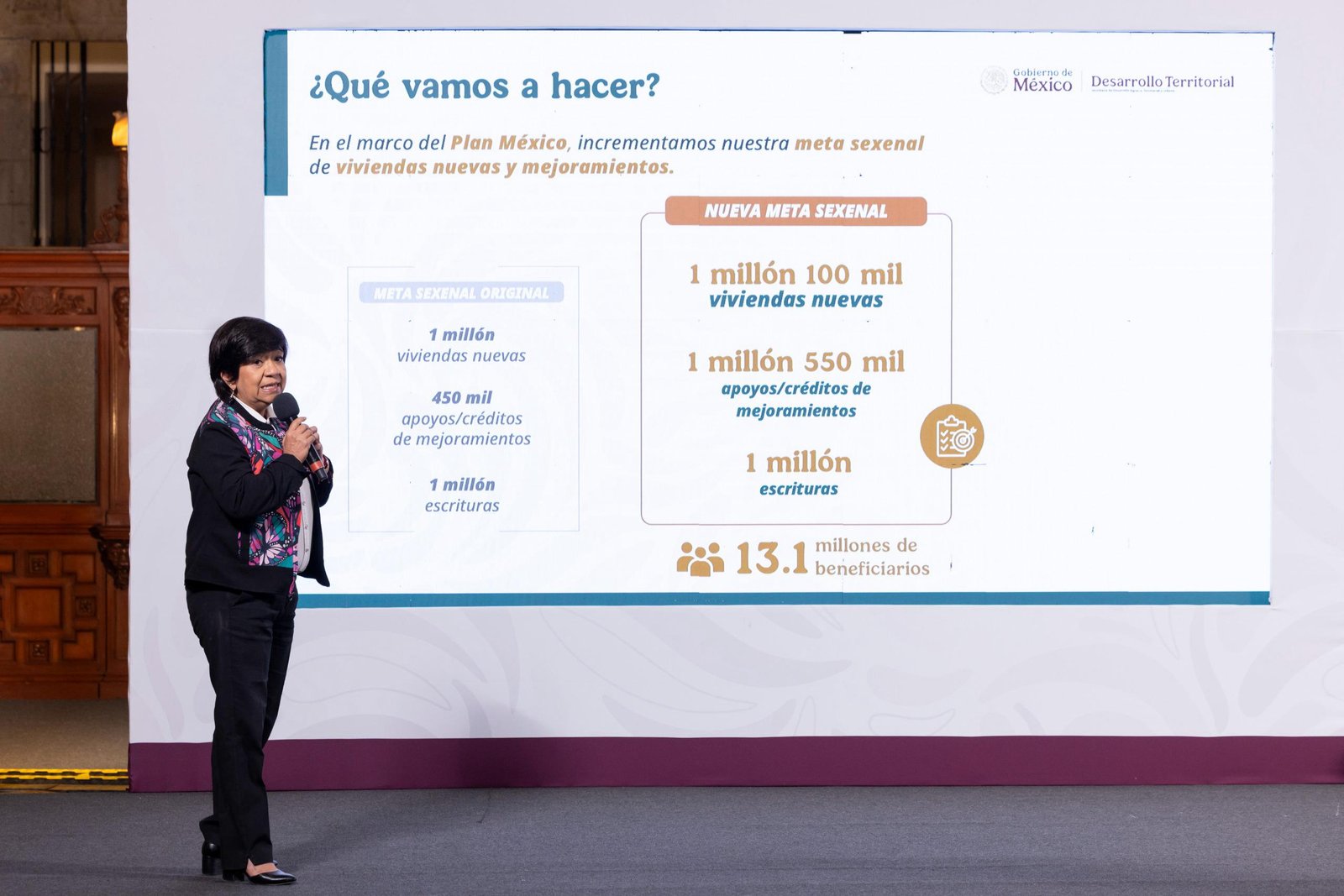 - En el marco del Plan México se incrementa la meta sexenal de viviendas nuevas de 1 millón a 1 millón 100; los mejoramientos pasarán de 450 mil a 1 millón 550 mil; y la regularización de escrituras se mantiene en 1 millón. Con ello se apoyará a 13.1 millones de beneficiarios.