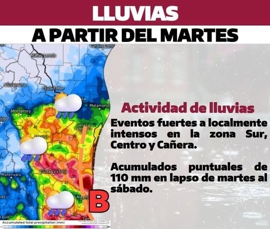 Octubre 07 de 2025, Ciudad Victoria, Tamaulipas .- La Coordinación Estatal de Protección Civil informa, que derivado de una zona de inestabilidad tropical procedente del Golfo de México, ocasionará un periodo de lluvias en el estado de Tamaulipas durante el periodo comprendido del martes 7 al sábado 11 de octubre de 2025, según lo dio a conocer el titular de la dependencia Luis Gerardo González de la Fuente.